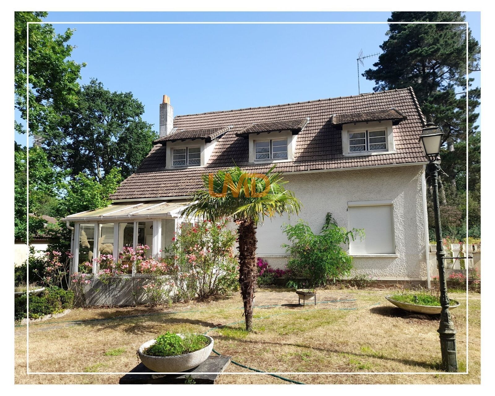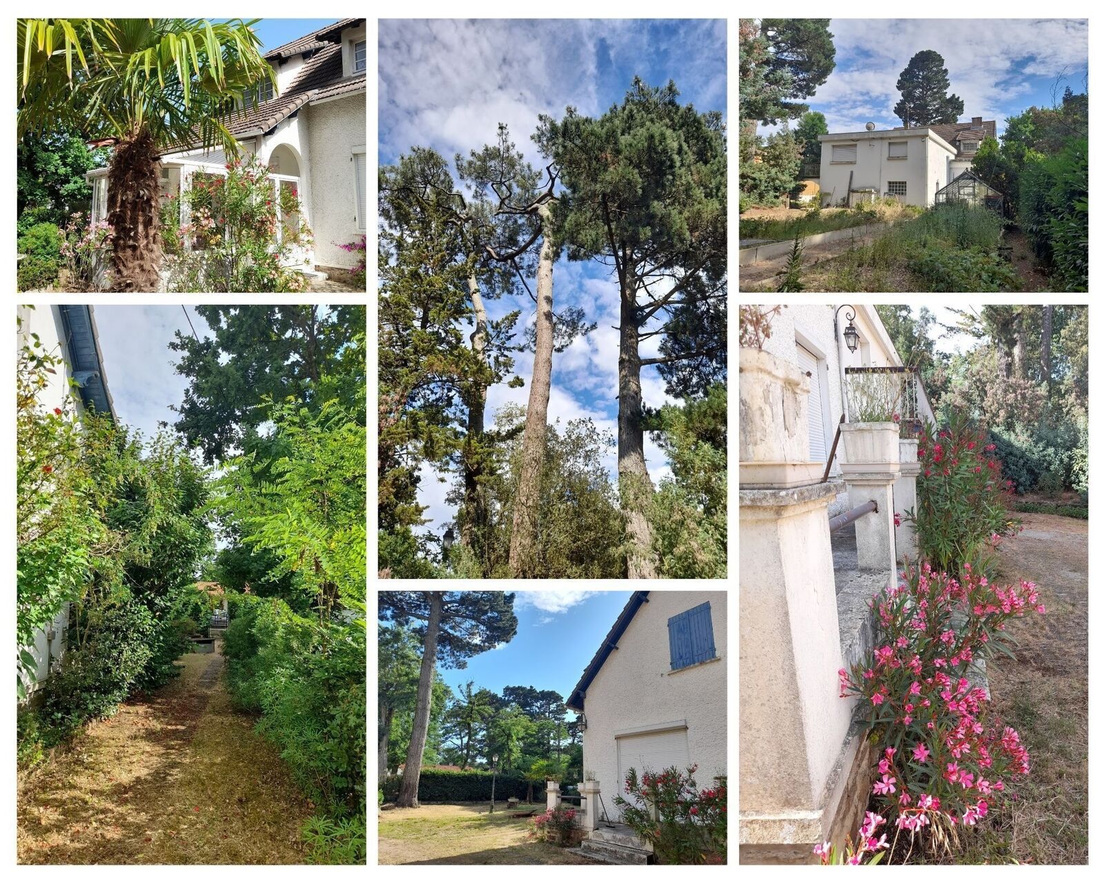 Implantée sur une belle parcelle arborée de 1 543 m², la maison développe plus de 200 m² habitables : un vaste séjour double avec cheminée, une véranda plein sud, six chambres, un bureau, ainsi que deux garages et une cave.