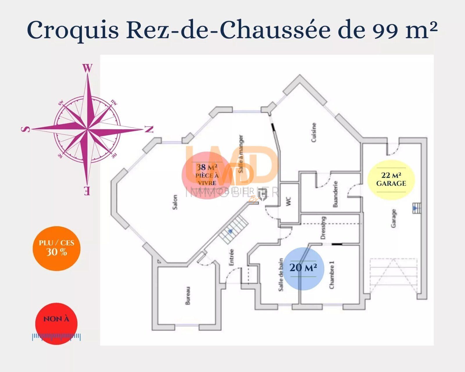 Espace de vie de 99 m² de plain-pied, comprenant un salon, une salle à manger et une cuisine semi-ouverte avec une verrière, orienté sud-ouest avec une terrasse de plus de 20 m² et un jardin lumineux. De la cuisine accès à une buanderie menant au garage.